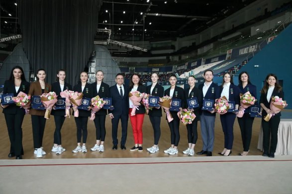 Гимнастки групповой команды, а также их тренеры Сияна Василева и Сабина Гаратова, судья Евгения Виляева, главный хореограф Кямиль Гулиев и генеральный секретарь Федерации Нурлана Мамедзаде получили из рук Мадата Гулиева юбилейные медали, выпущенные к 15-летию Министерства оборонной промышленности.