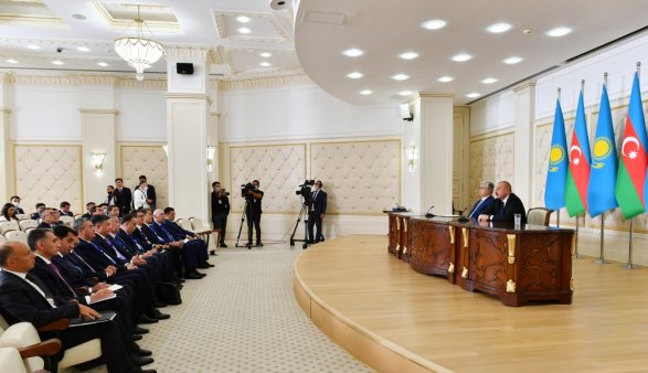 После церемонии подписания документов президенты Азербайджана и Казахстана - Ильхам Алиев и Касым-Жомарт Токаев выступили с заявлениями для печати