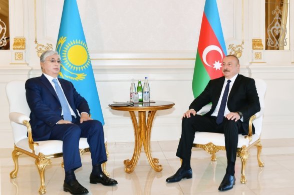 После церемонии официальной встречи состоялась встреча президентов Азербайджана и Казахстана Ильхама Алиева и Касым-Жомарта Токаева один на один.