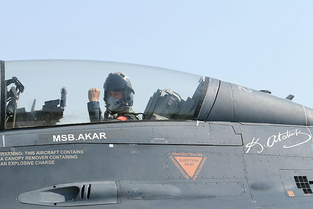 Министр национальной обороны Турции Хулуси Акар сел в кабину самолета F-16 для полета в воздушном пространстве Эгейского моря.