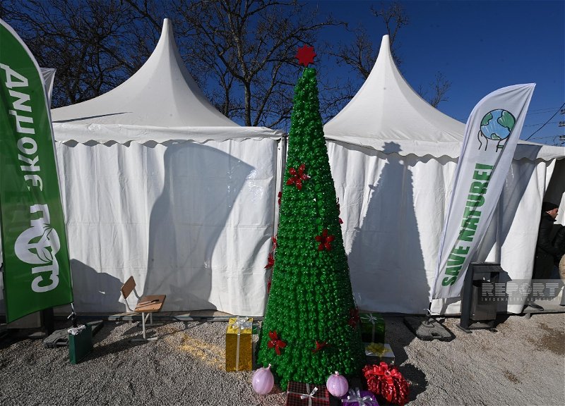 Экоактивисты устанавливают новогоднюю елку в районе проведения акции на дороге Ханкенди-Лачин