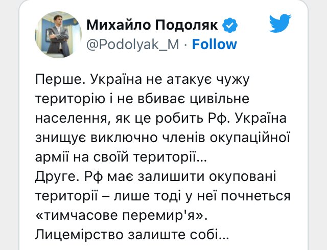 «РФ должна оставить оккупированные территории - только тогда у нее начнется "временное перемирие". Лицемерие оставьте себе»,— написал Подоляк в твиттере.
