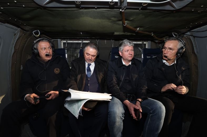 Акар и Столтенберг на вертолете облетели Хатай и осмотрели с воздуха ущерб, нанесенный землетрясением в городе.