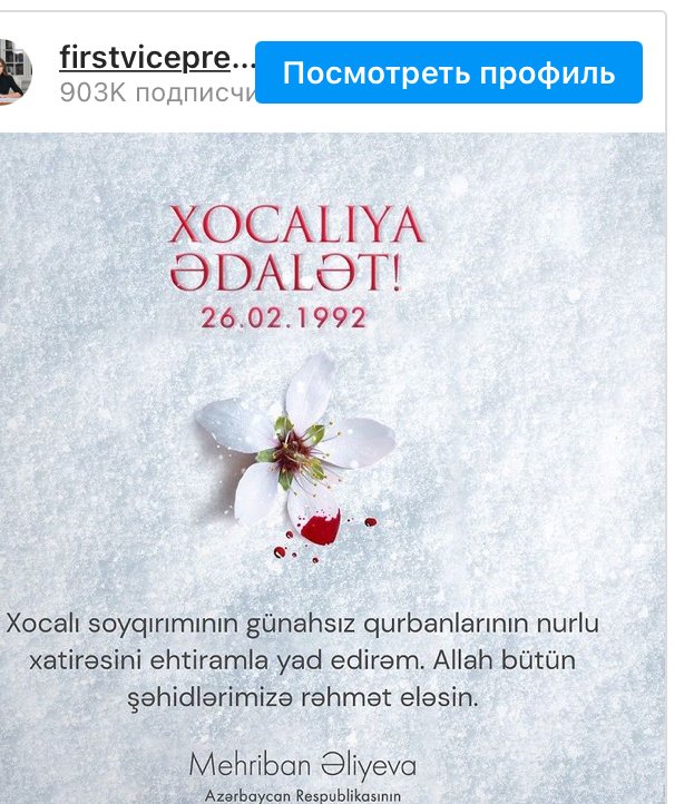 Первый вице-президент Азербайджана Мехрибан Алиева поделилась на своей официальной странице в Instagram публикацией в связи с 31-й годовщиной Ходжалинского геноцида.
