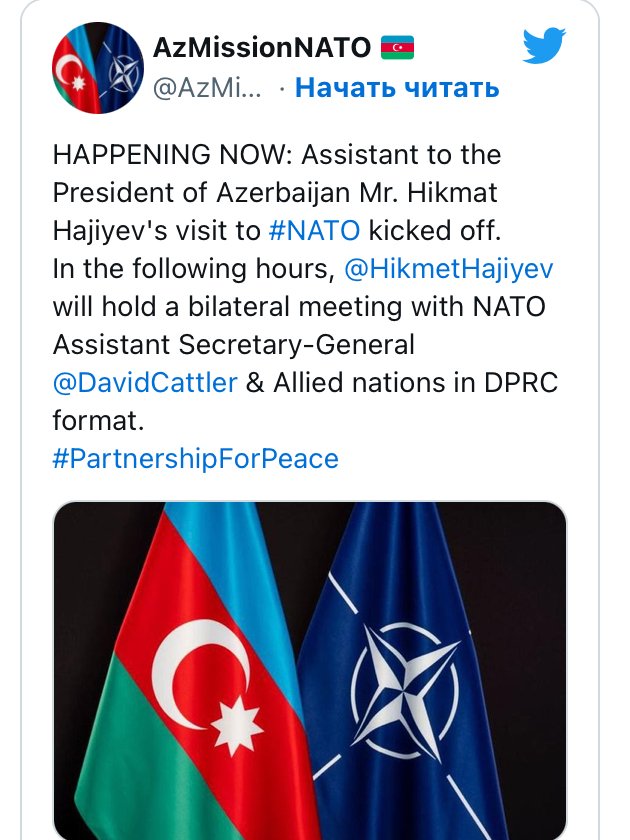 Помощник Президента Азербайджанской Республики - заведующий отделом по вопросам внешней политики Администрации главы государства Хикмет Гаджиев в ближайшие часы встретится с помощником генерального секретаря НАТО генералом Дэвидом Каттлером и представителями стран альянса.