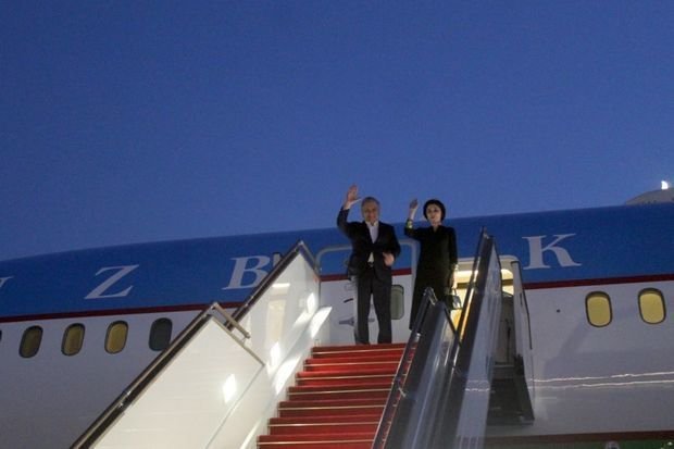Президента Узбекистана Шавката Мирзиеева и его супругу Зироатхон Мирзиееву провожали министр иностранных дел Азербайджанской Республики Джейхун Байрамов, специальный представитель Президента Азербайджанской Республики на освобожденных от оккупации территориях (за исключением Шушинского района), входящих в Карабахскую экономическую зону, Эмин Гусейнов и другие официальные лица.