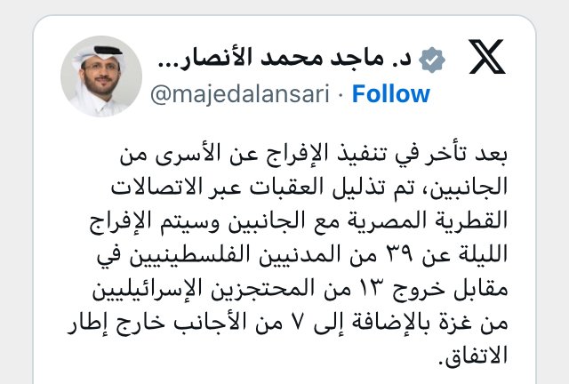 МИД Катара заявил, что ХАМАС освободит сегодня вечером 13 израильских заложников в обмен на освобождение из тюрем Израиля 39 палестинцев.