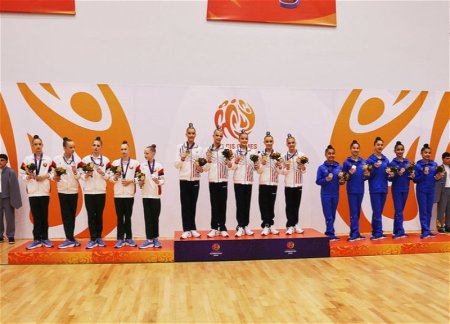 Kоманда Азербайджана по художественной гимнастике заняла третье место в групповых упражнениях с обручами и булавами.