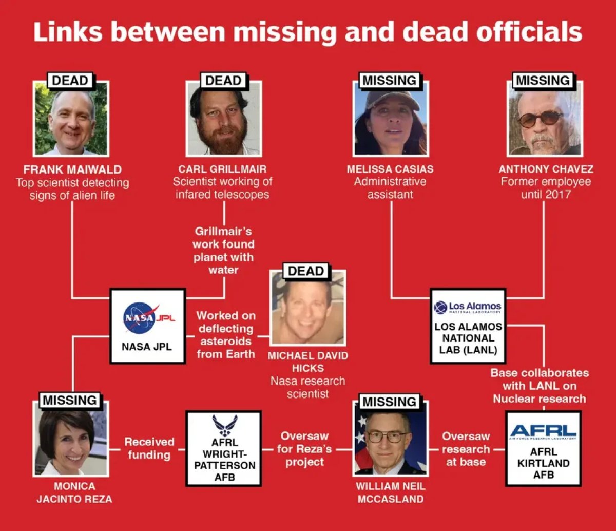 Отметим, что за последние два года 11 ученых, исследовавших НЛО (неопознанные летающие объекты) и НВЯ (неопознанные воздушные явления), а также работавшие в сфере ядерных исследований, были убиты или пропали без вести. Так, 47-летний Нуно Лурейро был убит в своем доме в Массачусетсе 15 декабря 2025 года. Тело 45-летнего Джейсона Томаса было обнаружено в 2026 году на берегу озера Куаннаповитт в том же штате Массачусетс три месяца спустя после своего исчезновения. 60-летняя Моника Реза, 53-летняя Мелисса Касиас, 79-летний Энтони Чавес, 48-летний бригадный генерал ВВС Уильям МакКастленд числятся пропавшими без вести с 2023 по 2026 год. Они исчезли из своих домов, пропали во время пробежек или во время публичных мероприятий. Социальные сети полны предположений о том, что кто-то хочет нанести непоправимый вред американским ученым, трудящимся в проектах, связанных с НЛО и ядерными исследованиями. Развернулись и сторонники различных экзотических теорий о том, что эти преступления могут как-то быть связанными с инопланетянами. Или, говорят другие, с действиями властей, которые хотели что-либо засекретить, связанное с НЛО. Исследователи обращают внимание на деятельность погибшего генерала МакКастленда и других связанных с ним сотрудников разных лабораторий, которые искали на земле и в космосе следы «летающих тарелок». Какая-либо связь между этими смертями и исчезновениями обнаружена не была. Известно лишь, что все эти люди работали со строго засекреченными документами.