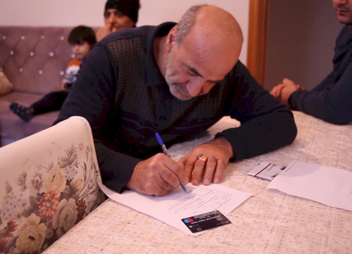 Директор Бакинского центра DOST №1 Эльвин Байрамов вручил банковскую карту для получения пенсии родителям шехида - Али и Эльяне Аллахвердиевым.