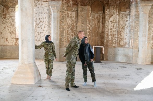 Затем Президент Ильхам Алиев, первая леди Мехрибан Алиева и их дочь Лейла Алиева посетили освобожденную от оккупации культурную столицу Азербайджана - Шушу.