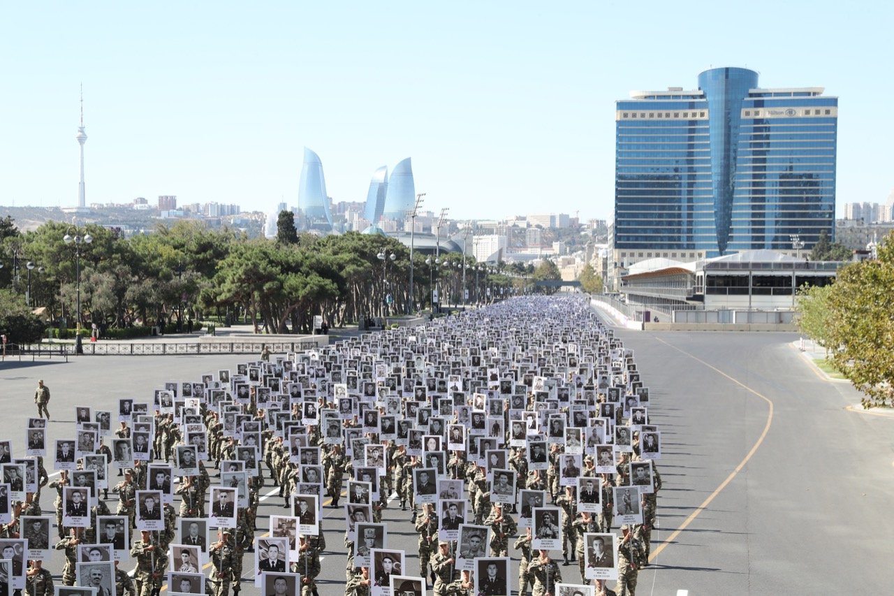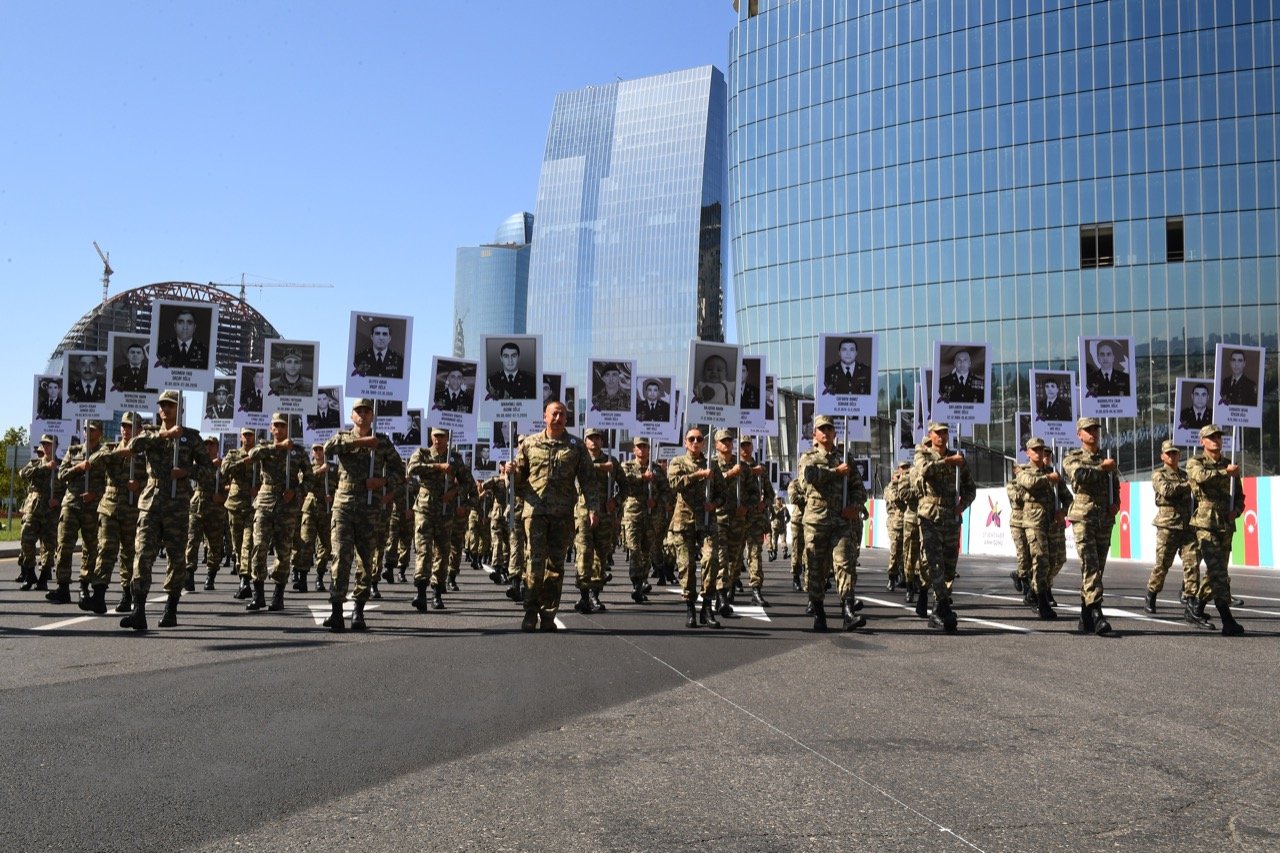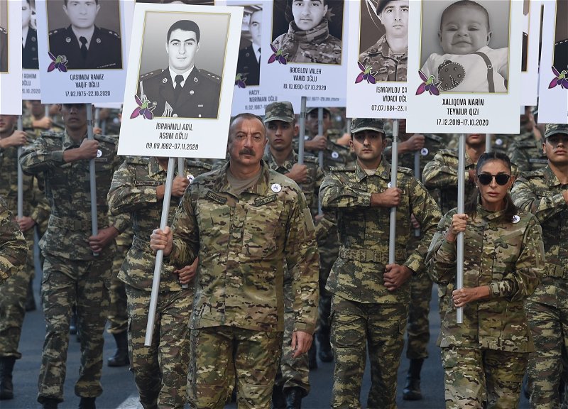 Президент Азербайджанской Республики, Верховный главнокомандующий Ильхам Алиев, первая леди Мехрибан Алиева, курсанты и военнослужащие участвовали в шествии с плакатами, содержащими фотографии военнослужащих и гражданского населения, убитых в результате антигуманных и военных преступлений, совершенных армянским государством во время Отечественной войны.