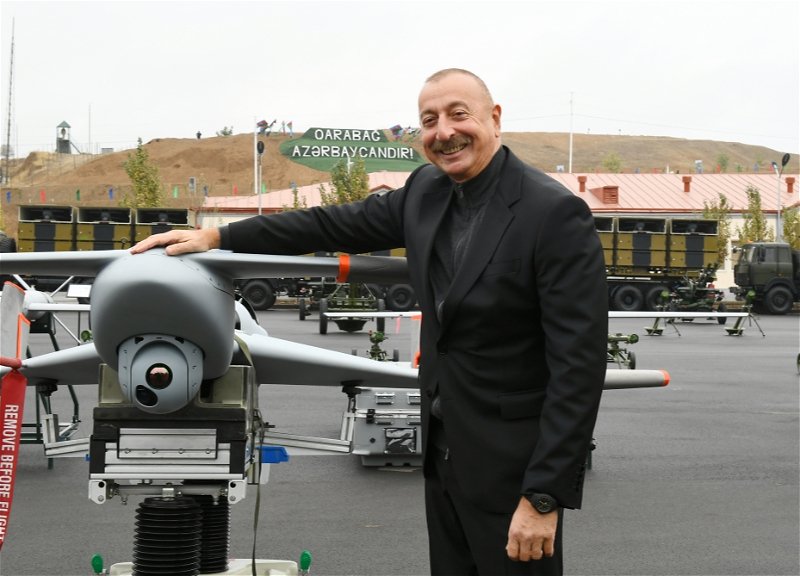 Президент Ильхам Алиев сел за руль бронированной боевой машины, осмотрел беспилотники Harop.