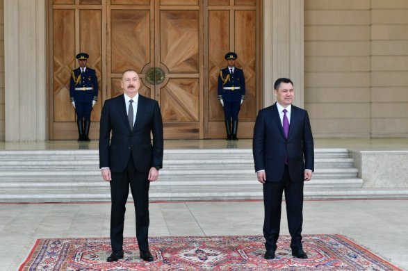 На площади, где развевались государственные флаги обеих стран, был выстроен почетный караул в честь президента Киргизии. Президент Ильхам Алиев приветствовал своего киргизского коллегу. Ильхам Алиев и Садыр Жров прошли перед отрядом почетного караула. Прозвучали государственные гимны двух стран.
